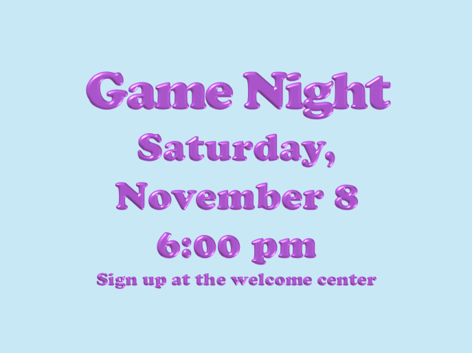 We are having a game night on Saturday, November 8th, at 6:00! You have looked at all the pictures in the Directory. Now you can get to know those faces better. We are going to play a crazy card game that is guaranteed to make you laugh. We will have snacks, but feel free to bring a snack to share if you like. Please sign up at the welcome center so we know how many card tables to set up. Look forward to seeing you there. The more the merrier!!! Questions? Ask Sherry Troutwine or Shirley Kremm.